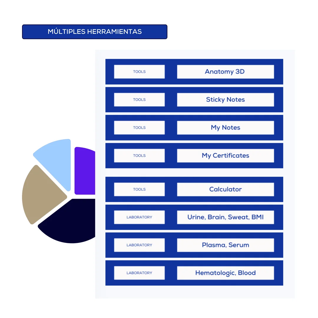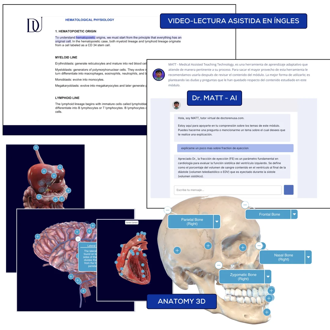 - Incluye a Dr. MATT (Medical Assisted Teaching Technology): Tutor médico virtual basado en inteligencia artificial especializada en educación médica, que puedes consultar en español o inglés 24/7.