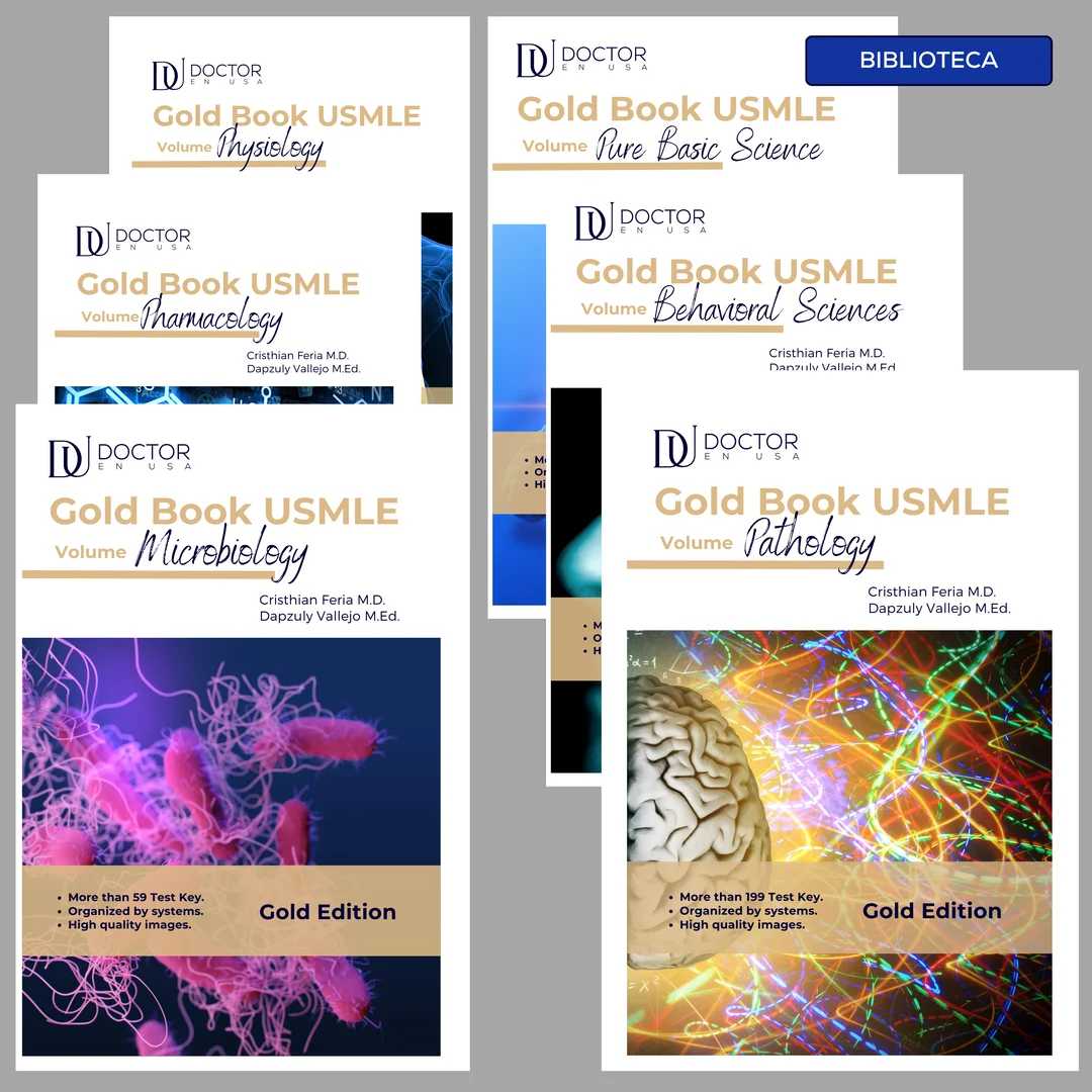 - Acceso a los 6 E-books de la biblioteca digital Gold Book USMLE en Español.